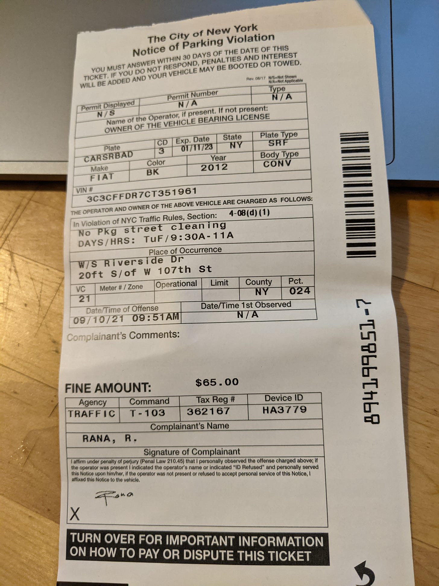 Allegedly blocking a crosswalk. The street cleaning thing, I just was out of town and it's a manual. Only, like, one of my friends knows how to drive it so I'm not in a great position to have somebody move it for me. Financially, I could put it in a garage for several hundred dollars for a weekend or I can just eat sixty five dollars and apologize to the street for not being clean on that eight-foot stretch.
